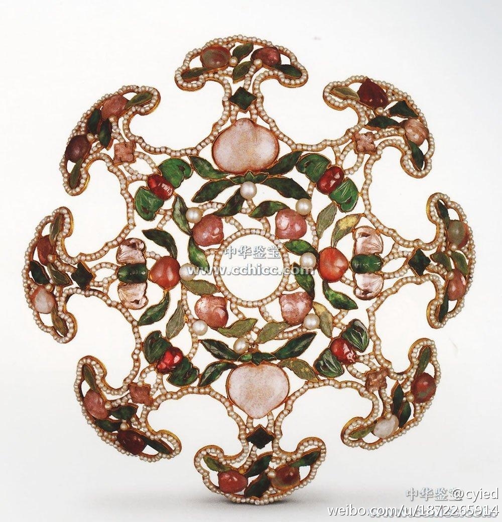 清 ,金镶珠翠帽花,径18厘。帽花圆形,内外两层纹饰,内层由翠片、碧玺组成六只蝙蝠,蝙蝠头顶嵌珍珠,两侧各有寿桃一个;外层八个如意头纹饰,内由翠片,碧玺组成花朵。内外纹饰边沿满缀米珠。桃、蝠纹寓意“福寿万年”。”(中华鉴宝网)