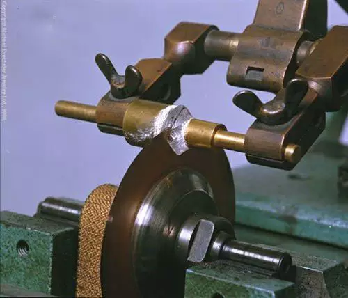 钻石毛坯按照预期的成品形状磨出一个大致的轮廓,是琢磨刻面前的预备阶段。操作者通过去除多余的材料为后续工作初步准备出亭部以及与台面相垂直的腰部。这项任务由粗磨机来完成,我们可以将其看作是一台精密的机械车床。有两种粗磨机:单轴的与双轴的,后者更多的用于颗粒较小的